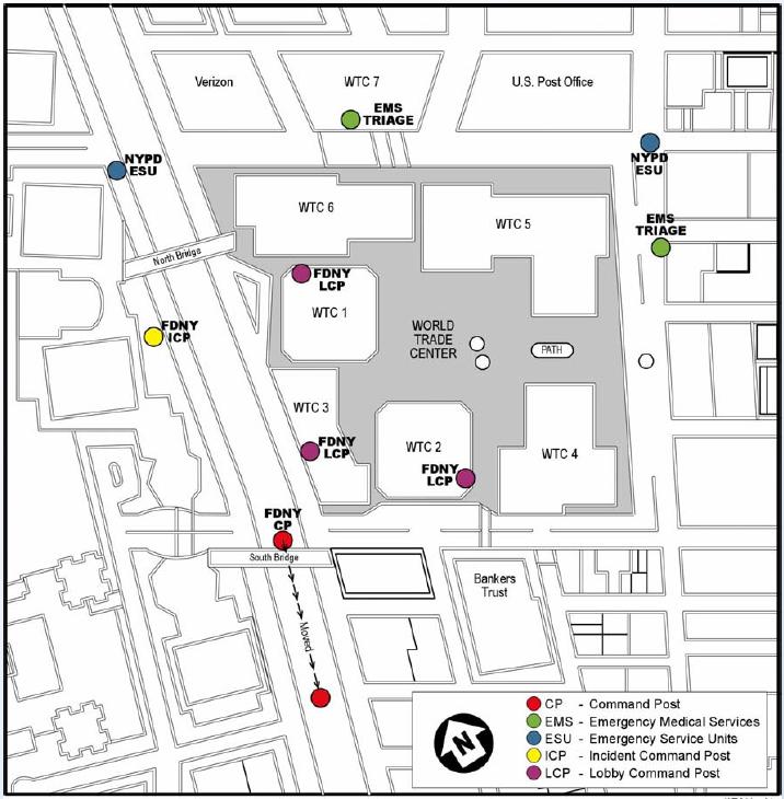 El Departamento de Bomberos desplazó además una furgoneta de comunicaciones (indicativo “Field Comm”), que desafortunadamente casi no se utilizó y que finalmente quedó destrozada tras el derrumbe de los edificios. Esta furgoneta estaba dotada con un repetidor en banda cruzada UHF-VHF. Su objetivo era establecer enlaces en UHF con los puestos de mando instalados en los halls de acceso a las dos torres principales y retransmitirlos a través de los canales de VHF habituales del Departamento hacia los bomberos que estaban trabajando en las plantas más altas. De las dos furgonetas de este tipo disponibles, la principal estaba averiada y tuvo que utilizarse la de respaldo, con el inconveniente de que esta última no disponía de ningún canal de comunicaciones con los helicópteros de la Policía.